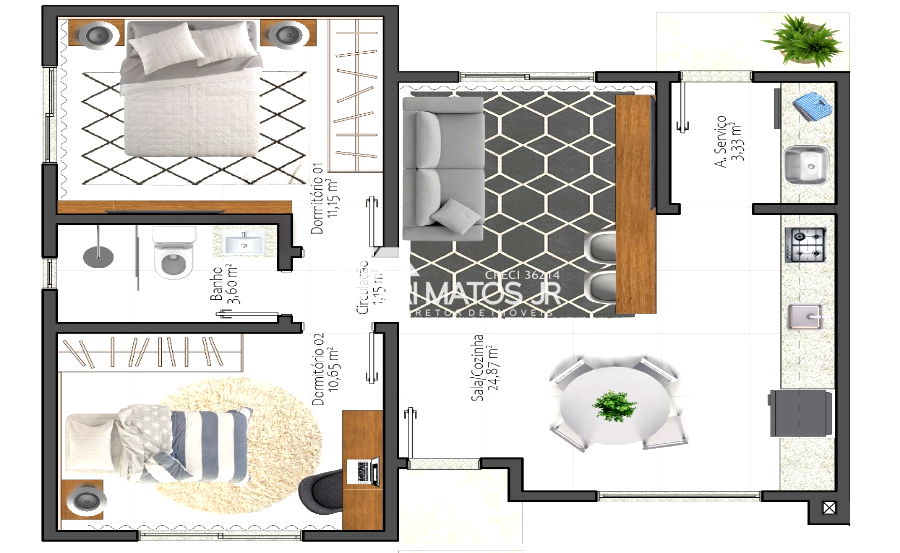 São aproximadamente 62,43m² de área construída, distribuídos em: