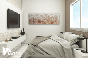 São 58m² de área privativa, com acabamento de primeira qualidade. Piso porcelanato, teto em gesso, e massa corrida nas paredes internas. Área global de 103m².