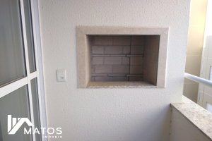 Imóvel à venda, com 2 dormitórios, sacada com churrasqueira, cozinha, janelas brancas em alumínio com veneziana.